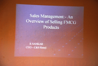 The EIP session on Saturday (07.08.10) opened up with the presence of our eminent chief guest Mr.R.Shankar, CEO, C&S Retail. The topic for the session was “Sales Managemant: An overview of FMCG Products”. Mr.R.Shankar started the session by explaining the core concepts of sales management. He explained the different types of selling and the varied strategies to be used in each type of selling. Many real time examples stated by him were great eye-openers for us. For example, he narrated the sucess story of the giant, Eureka Forbes, which made their sales people to master tough selling. He also came up with a new and interesting expansion for SALES: Sell, Analyse, Lea , Emphasize and Study. We also had an interaction session with him. The entire session was interesting and we gained a lot of knowledge on holistic sales management.