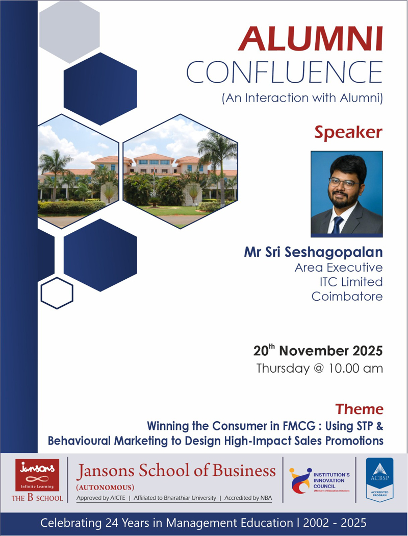 Jansons School of Business is thrilled to host one of our distinguished alumni, Mr Sri Seshagopalan, Area Executive, ITC Limited, Coimbatore, for an interactive session with our students!