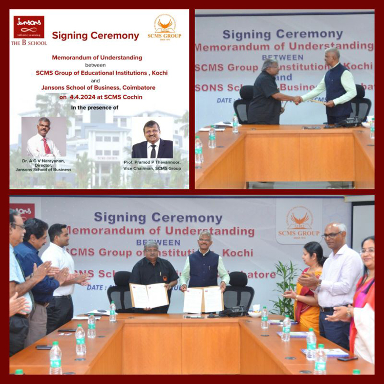 Jansons School of Business and SCMS GROUP OF INSTITUTIONS, Cochin have signed a Memorandum of Understanding on 4th April 2024 at SCMS Campus, Cochin. |