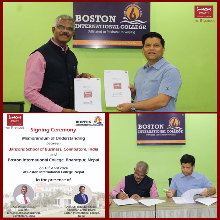 Jansons School of Business is glad to collaborate with Boston International College, Bharatpur, Nepal by signing a Memorandum of Understanding on 18.04.2024 at Boston International College, Campus at Nepal with the august presence of Dr. A G V Narayanan, Director - Jansons School of Business and Mr. Ananda Bahadur Chand, Chairman of the Board, Boston International College, Nepal. |