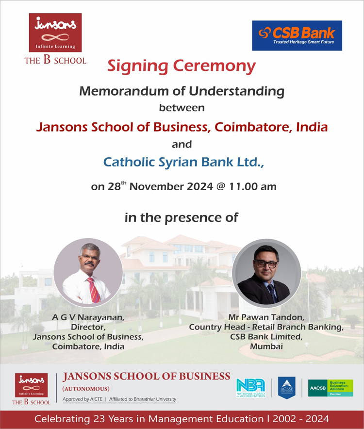 Signing Ceremony of MoU between Jansons School of Business, Coimbatore and Catholic Syrian Bank Ltd., |