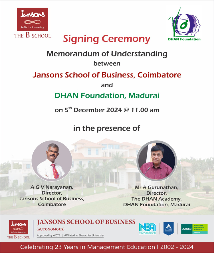 Signing Ceremony of MoU between Jansons School of Business, Coimbatore and DHAN Foundation, Madurai |