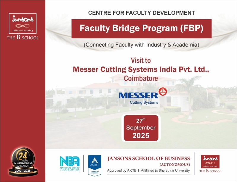 A Visit to Messer Cutting Systems India Limited, Coimbatore ![]() The Centre for Faculty Development JSB is organizing a 'Faculty Bridge Program (FBP)'. |