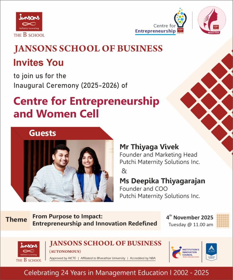The Centre for Entrepreneurship and Women Cell of Jansons School of Business are all set to inaugurate their activities for the academic year 2025–2026 on 4th November 2025 (Tuesday) at 11:00 a.m. |